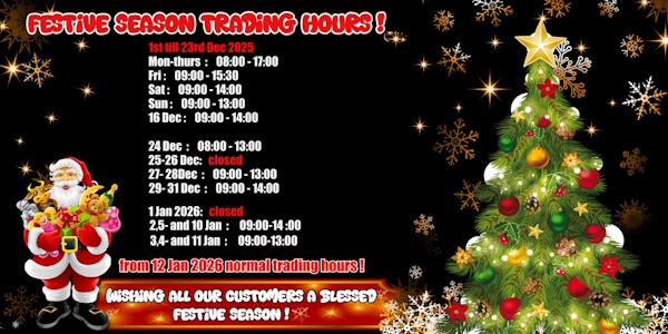 | Operational Hours: | Monday - Thursday: 08H00 - 18H00 Friday: 08H00 - 15H30 Saturday: 09H00 - 13H00 Sunday: 09H00 - 13H00 Pub Hols: 09H00 - 13H00 |
