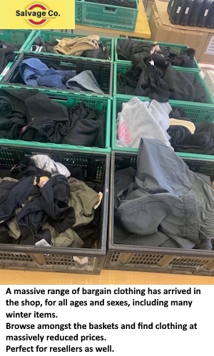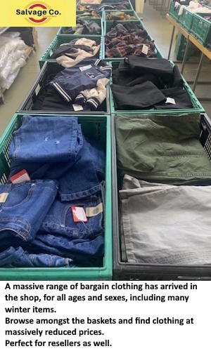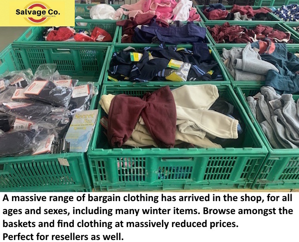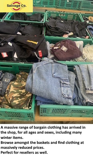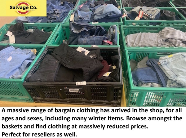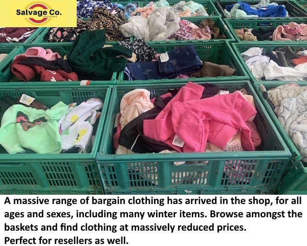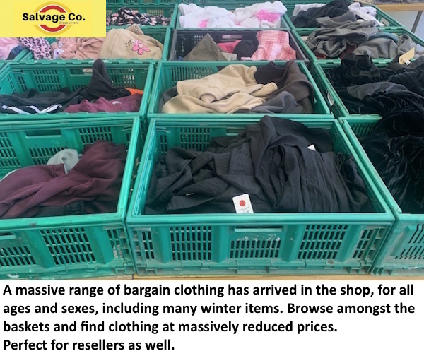 A massive range of bargain clothing has arrived in the shop, for all ages and sexes, including many winter items. Browse amongst the baskets and find clothing at massively reduced prices. Perfect for resellers as well.